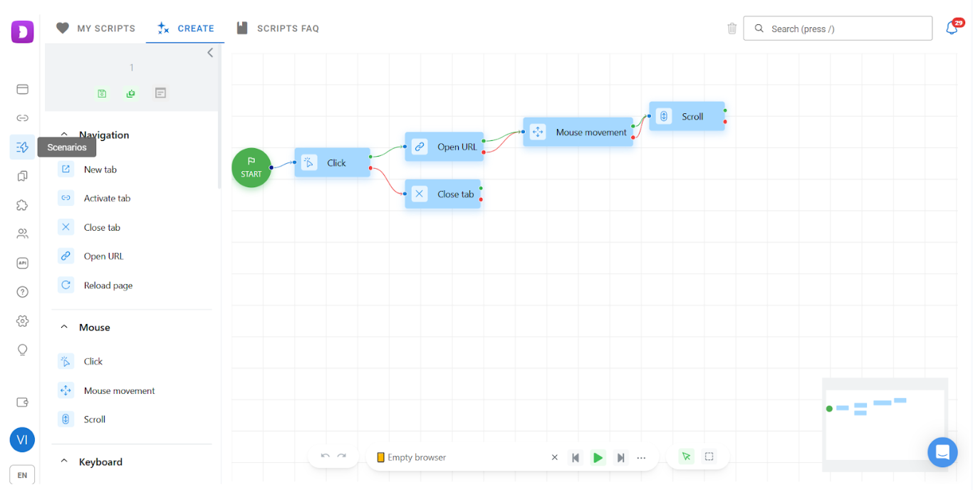 Scenarios work as follows: first, you build a script from a sequence of simple actions and save it. Then, you can run it in your browsers.