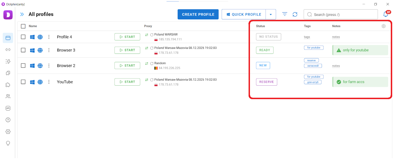 Most of the work in Dolphin Anty is done through the profile list. Since the list can contain many browsers, visual navigation tools are provided — tags, statuses, and notes.