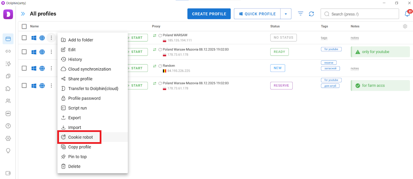 Cookie robot. Activate the feature → paste a list of URLs → start collecting cookie files. If you’ve just created a browser, the robot will “build its history,” making your digital profile more trustworthy to websites. Browsers without cookies look suspicious. Manually warming up cookies can take several days.
