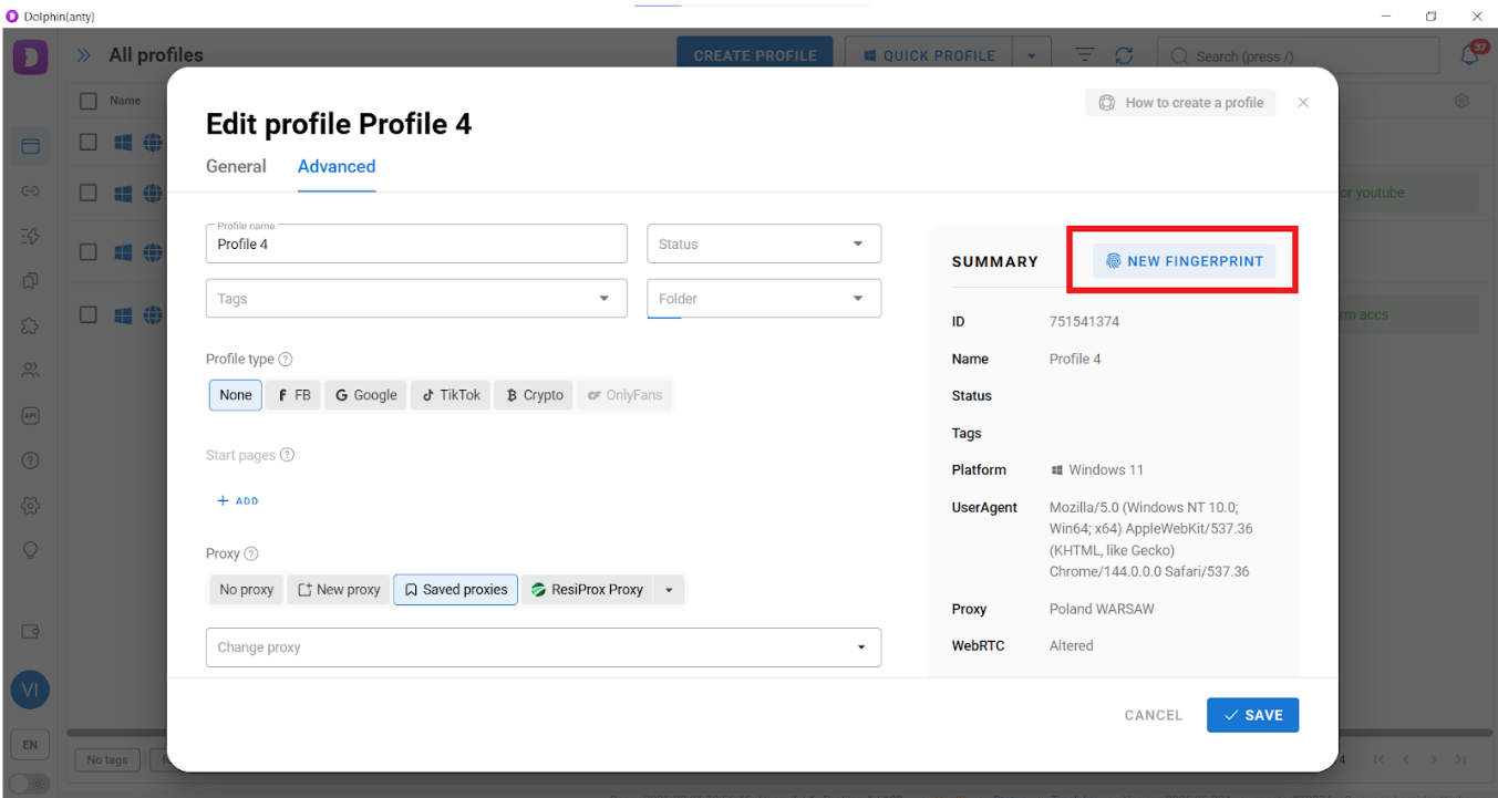 Most importantly: Dolphin Anty does not generate fingerprints from random parameters. The system uses fingerprints of real users. When you create a profile, Dolphin Anty selects a real fingerprint that best matches your antidetect browser proxies and chosen operating system.