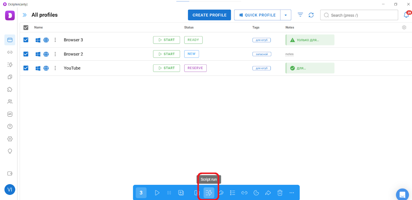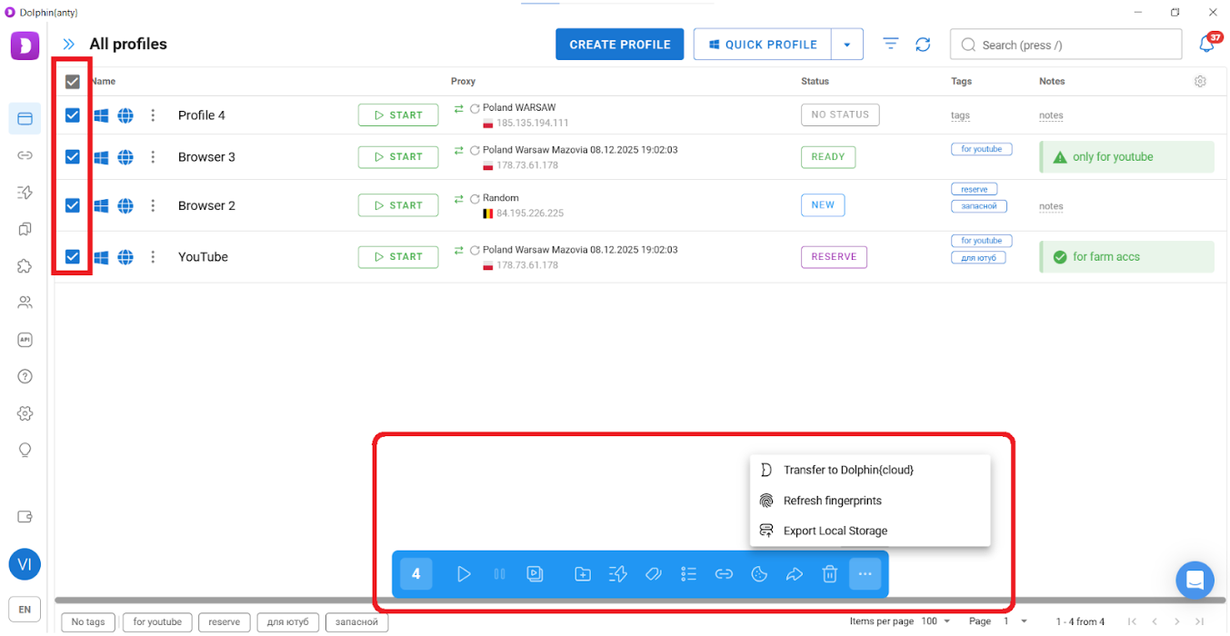 In Dolphin Anty, you can select the required browsers and perform the following actions with them: