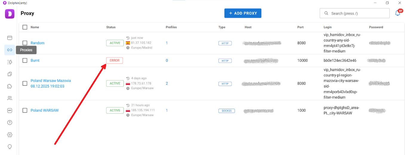 First, download Dolphin Anty (you can register after installation) and purchase proxy ports from IPCloud. You can add proxies directly when creating a working profile, but it’s better to first go to the dedicated section with the list of ports and use the “Add Proxy” button. Note that if you add an incorrect or non-working proxy port, the status column will display “Error”.