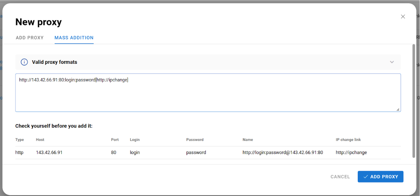 Next, go to your IPCloud dashboard and copy the port details exactly as they are. Then return to the antidetect browser and click “Add Proxy.” It’s best to choose the “Mass addition” tab so you can paste the proxy port details in one click.