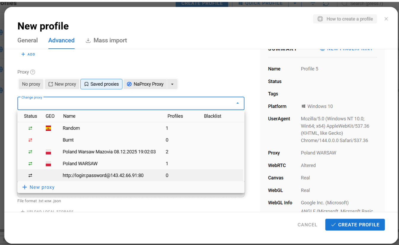 Most importantly: Dolphin Anty does not generate fingerprints from random parameters. The system uses fingerprints of real users. When you create a profile, Dolphin Anty selects a real fingerprint that best matches your antidetect browser proxies and chosen operating system.